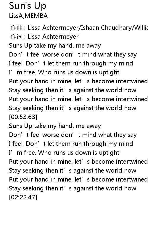 | [00:00.79] | Suns Up take my hand, me away |