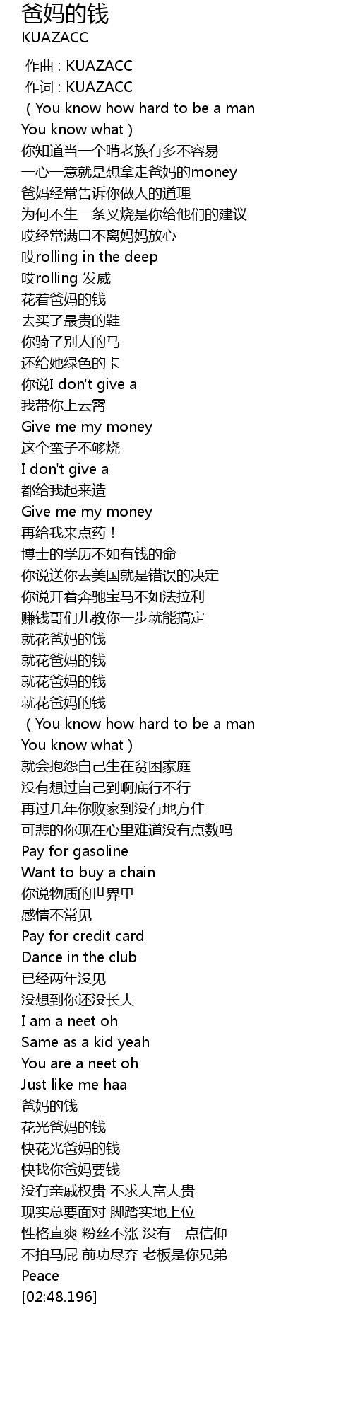 | [00:17.687] | 一心一意就是想拿走爸妈的money |