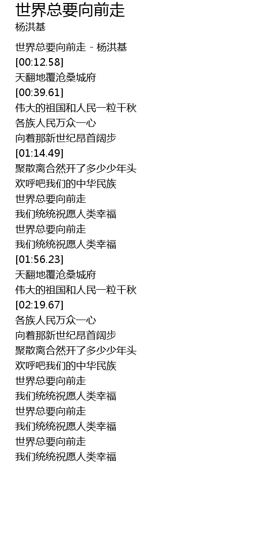 | [00:01.05] | 世界总要向前走 - 杨洪基 |