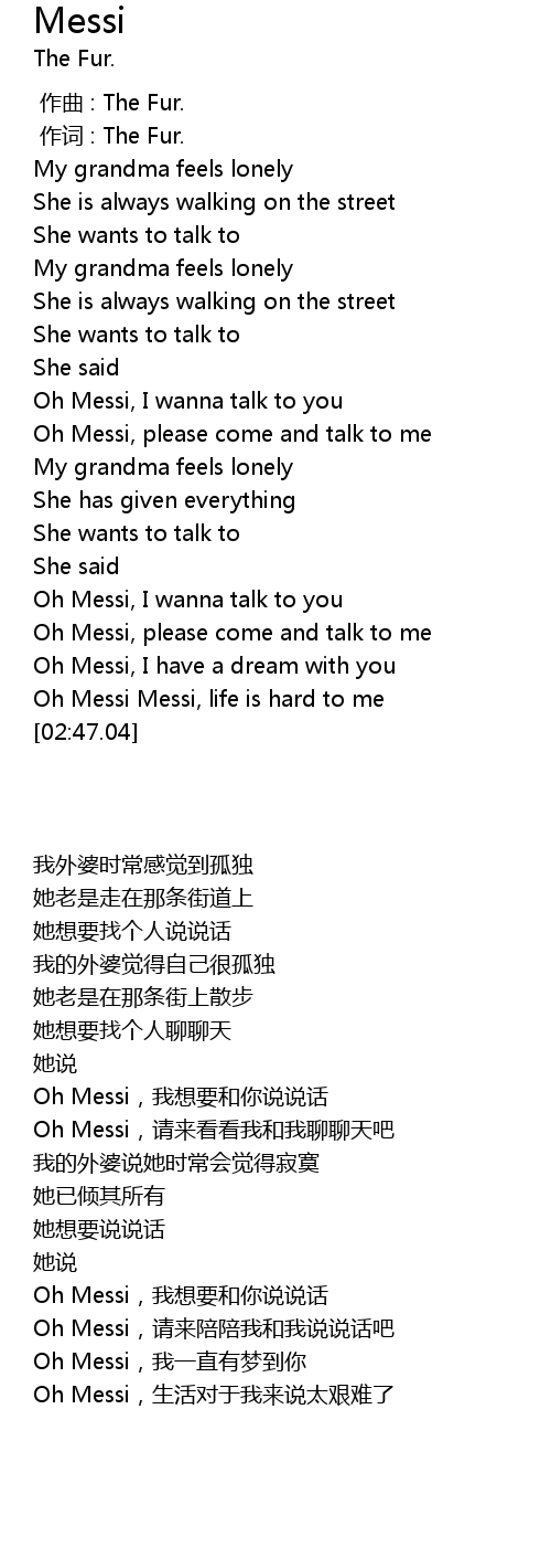 | [02:04.51] | Oh Messi, I wanna talk to you |