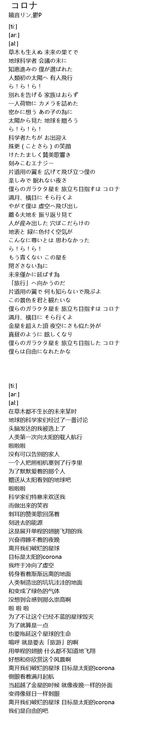 | [03:33.48] | 僕らのガラクタ星を 旅立ち目指した コロナ |