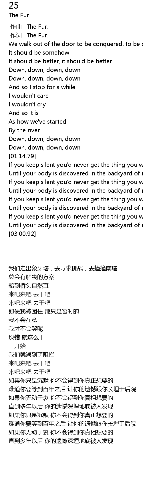 | [02:25.01] | If you keep silent you' d never get the thing you wanna get |