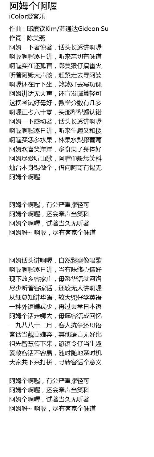 | 阿姆尽爱听山歌,阿喔仰般恁笑科 | |
