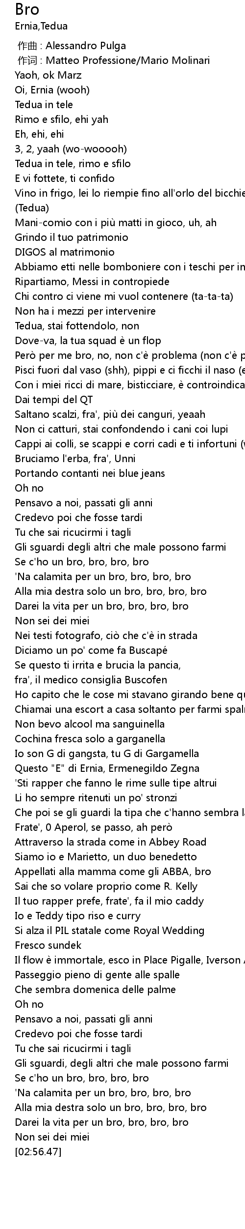 | [02:46.67] | Alla mia destra solo un bro, bro, bro, bro |