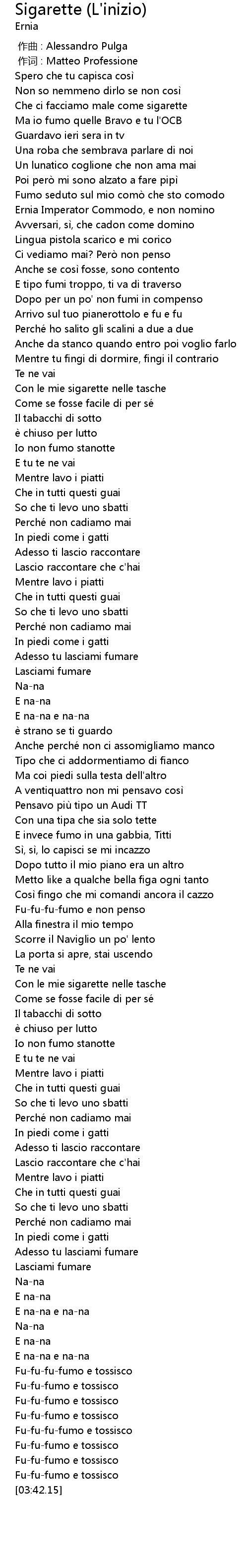 | [02:04.68] | Fu-fu-fu-fumo e non penso |
