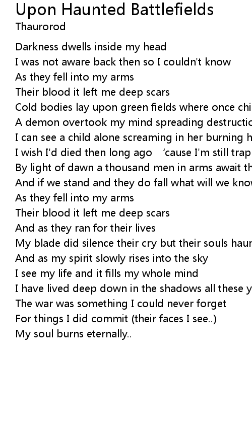 | I wish I' d died then long ago ' cause I' m still trapped upon these fields | |