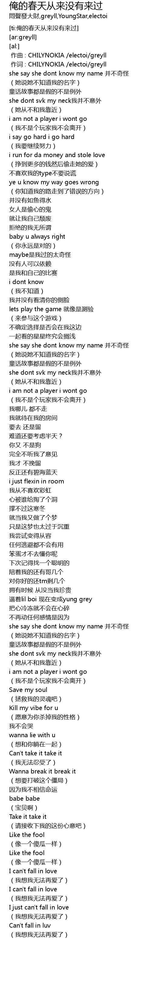 | [02:52.00] | bī zhe lil boi xiàn zài biàn chéng yung grey |