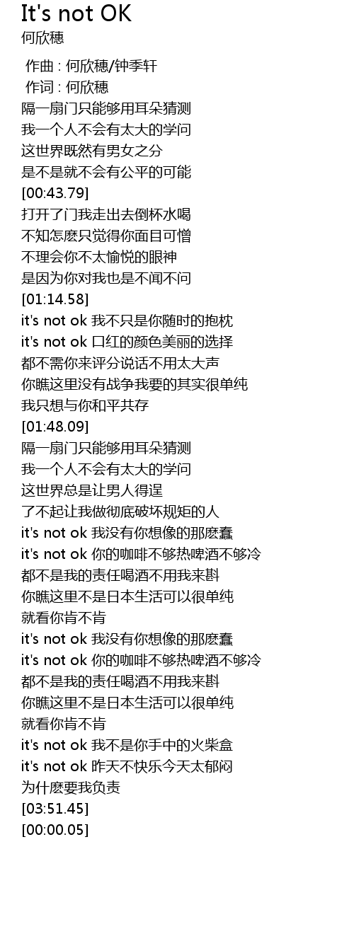 | [03:32.56] | it's not ok 我不是你手中的火柴盒 |