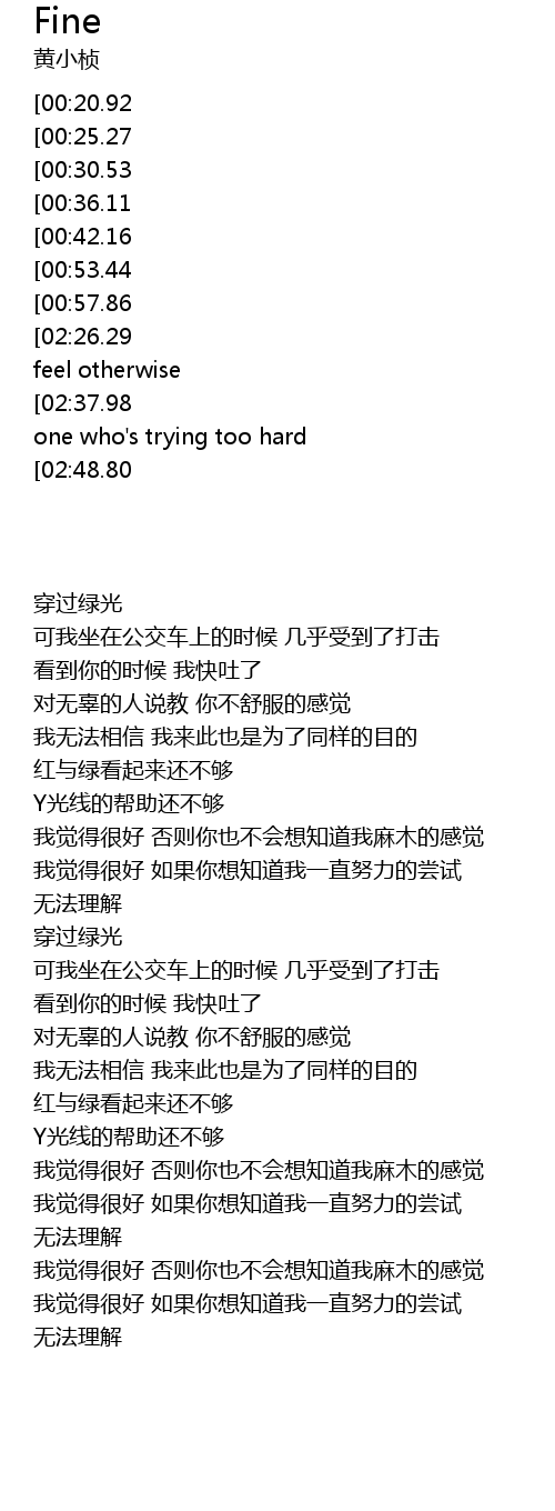 | [03:07.60][02:37.98][01:16.18] | I feel fine, if you care to know I'm always the one who's trying too hard |