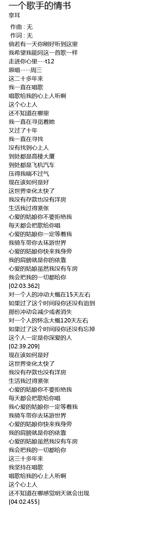 | [03:01.822] | 心爱的姑娘你不要拒绝我 |