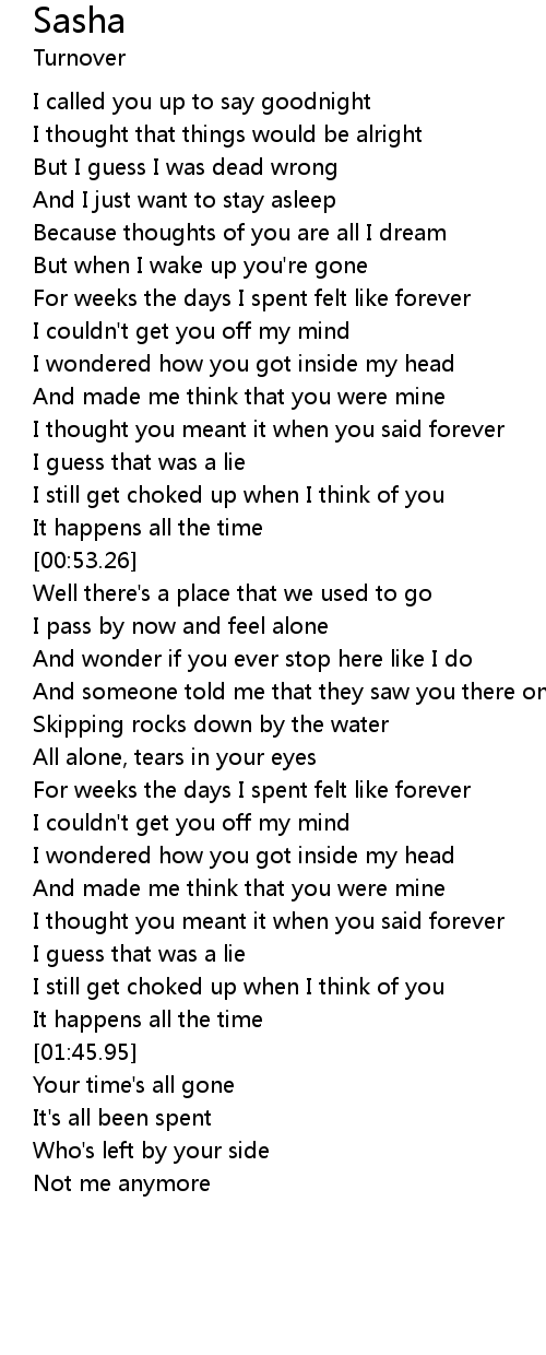 | [01:23.57] | For weeks the days I spent felt like forever |