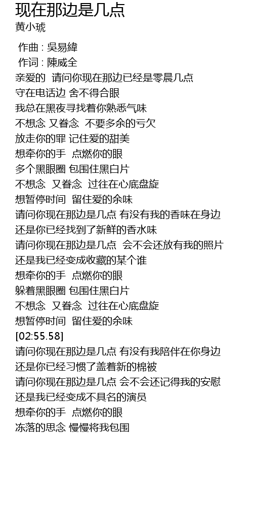 | [03:35.94] | 请问你现在那边是几点 会不会还记得我的安慰 |