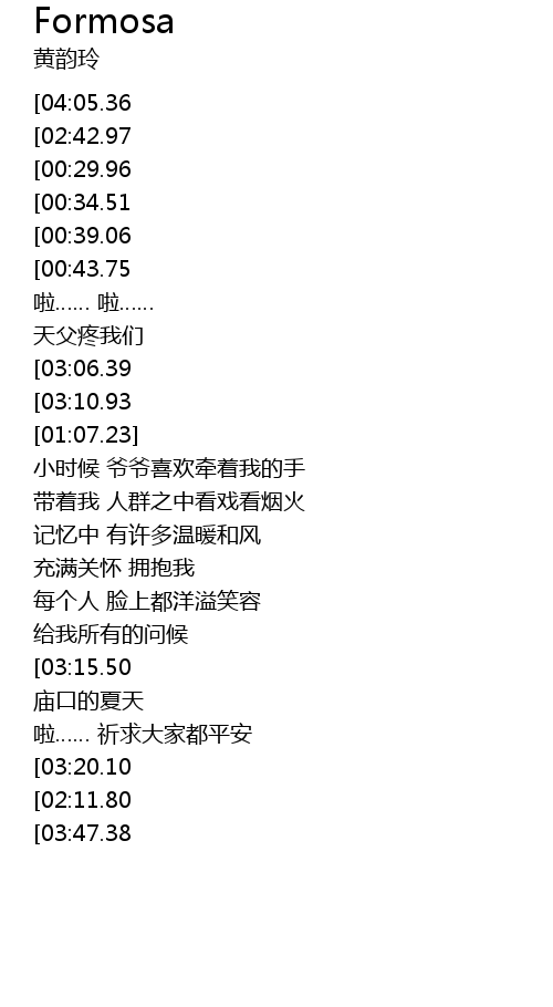 | [04:23.83][04:05.36][02:38.20][00:20.84] | 小时候 喜欢爸爸牵着我的手 |