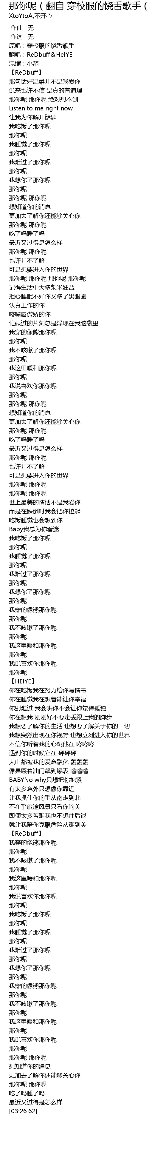 | [00:02.20] | 翻唱:ReDbuff&HeIYE |