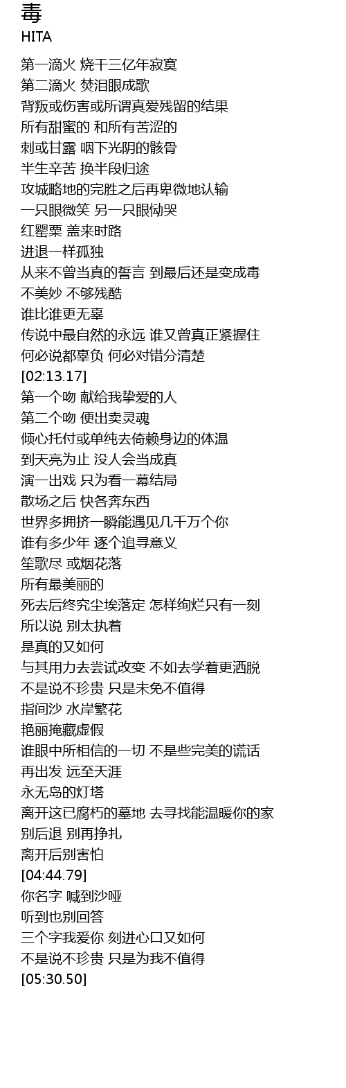 | [01:33.79] | 从来不曾当真的誓言 到最后还是变成毒 |