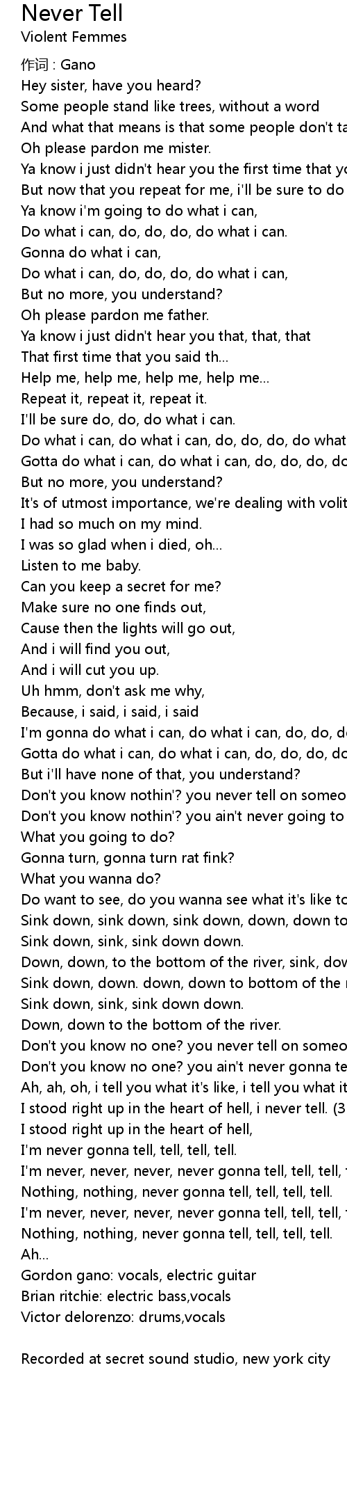 | I' m never, never, never, never gonna tell, tell, tell, tell. | |
