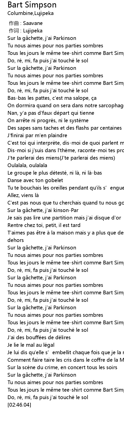 | [02:02.84] | Tous les jours le m me teeshirt comme Bart Simpson |