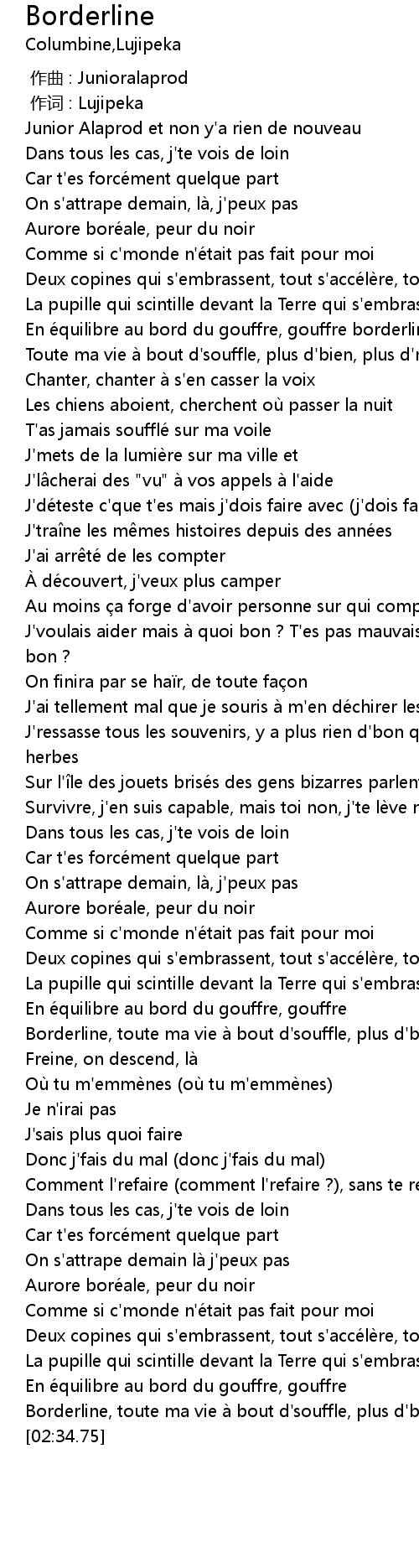 | [01:47.33] | Borderline, toute ma vie à bout d' souffle, plus d' bien, plus d' mal |
