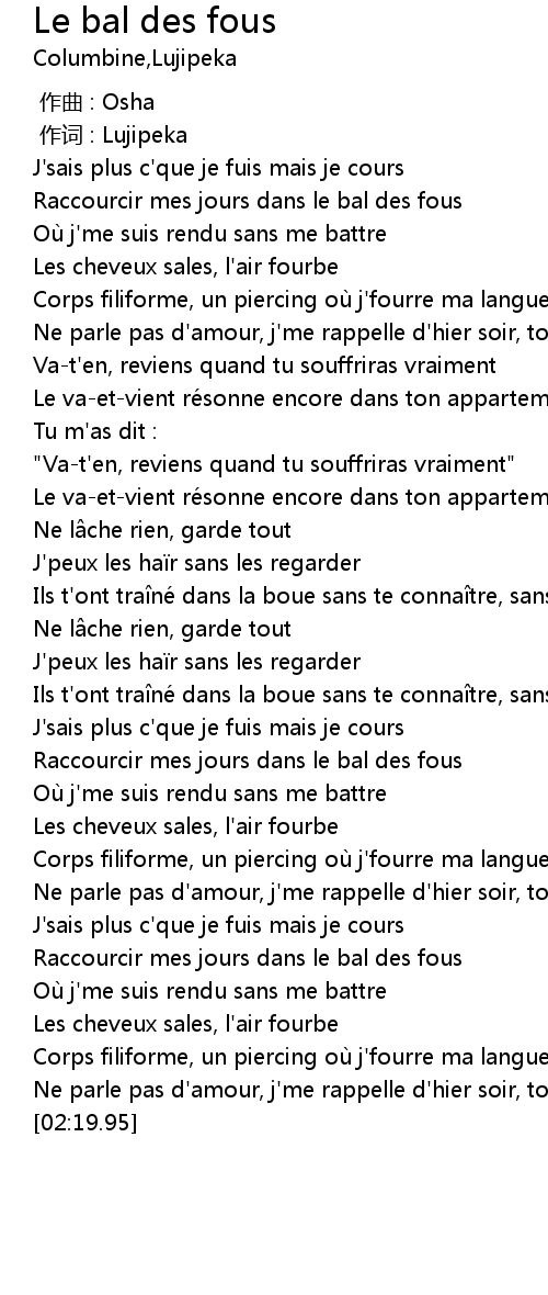 | [02:00.19] | Raccourcir mes jours dans le bal des fous |