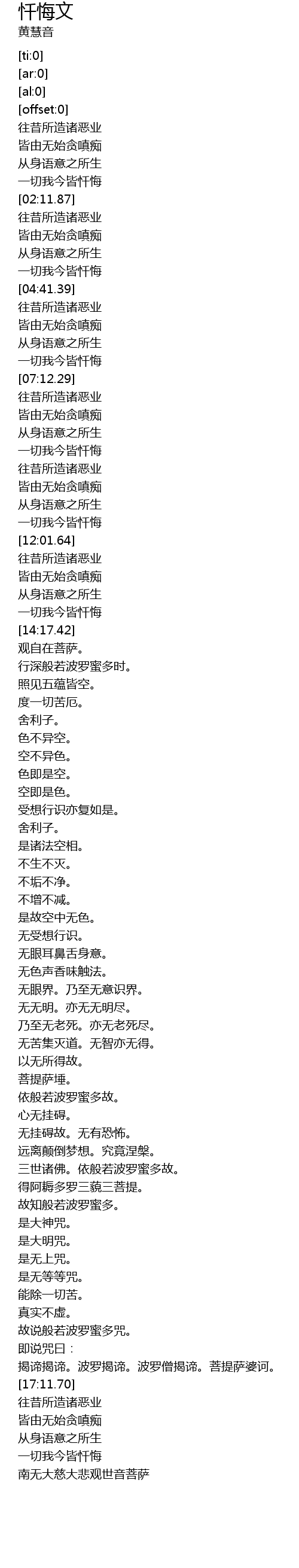 | [16:56.87] | 揭谛揭谛。波罗揭谛。波罗僧揭谛。菩提萨婆诃。 |