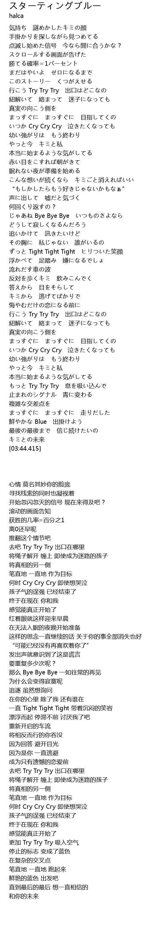 | [03:30.489] | 鮮やかな Blue 出掛けよう |