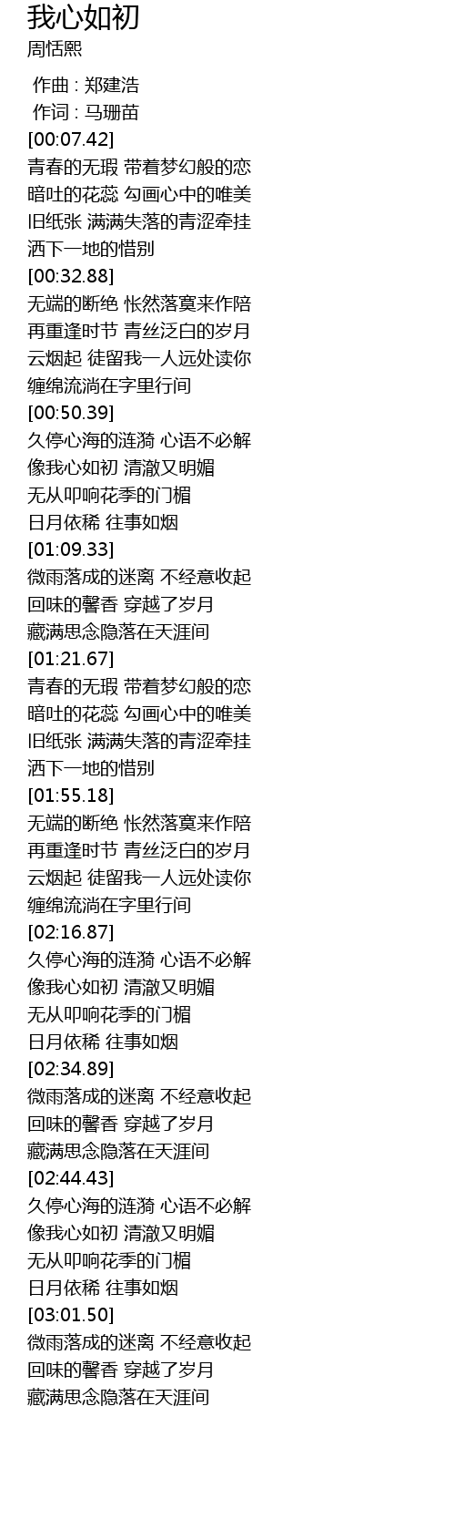 | [02:18.38] | 像我心如初 清澈又明媚 |