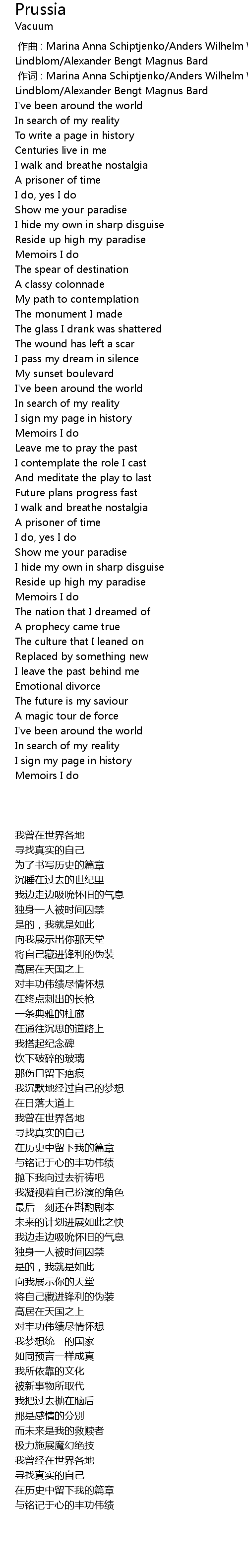 | [00:01.00] | 作词 : Marina Anna Schiptjenko/Anders Wilhelm Wollbeck/Mattias Lindblom/Alexander Bengt Magnus Bard |