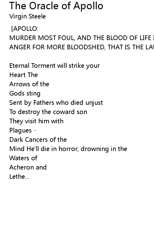 [MUSIC AND LYRICS BY DAVID DEFEIS] [APOLLO:] "WHEN THE FLESH OF LIFE IS RENT BY MURDER MOST FOUL, AND THE BLOOD OF LIFE IS FREED UPON THE AIR IT CRIES OUT IN ANGER FOR MORE BLOODSHED, THAT IS THE LAW! HE WHO INFLICTS DEATH MUST SUFFER THE PAIN OF RETRIBUTION, IT IS THE ANCIENT WISDOM OF THE AGES... OR..." [ORESTES:] |