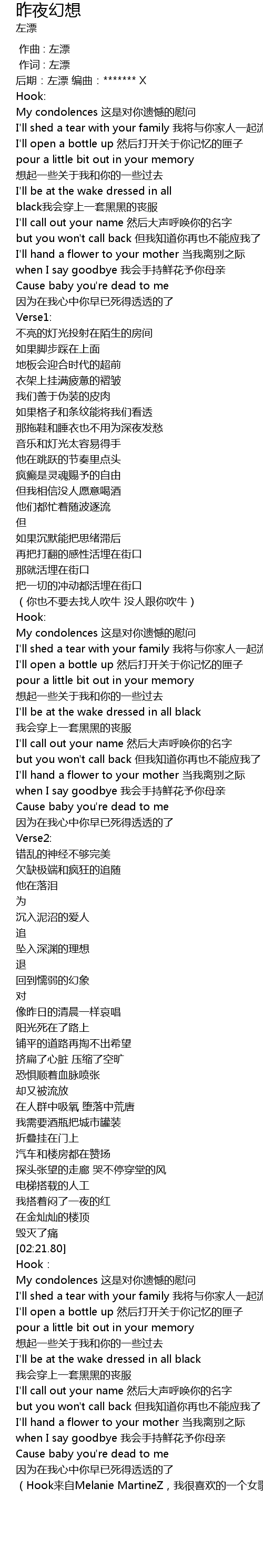 | [00:16.62] | I' ll be at the wake dressed in all black wo hui chuan shang yi tao hei hei de sang fu |