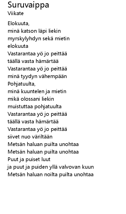 | Metsän haluan noilta puilta unohtaa |