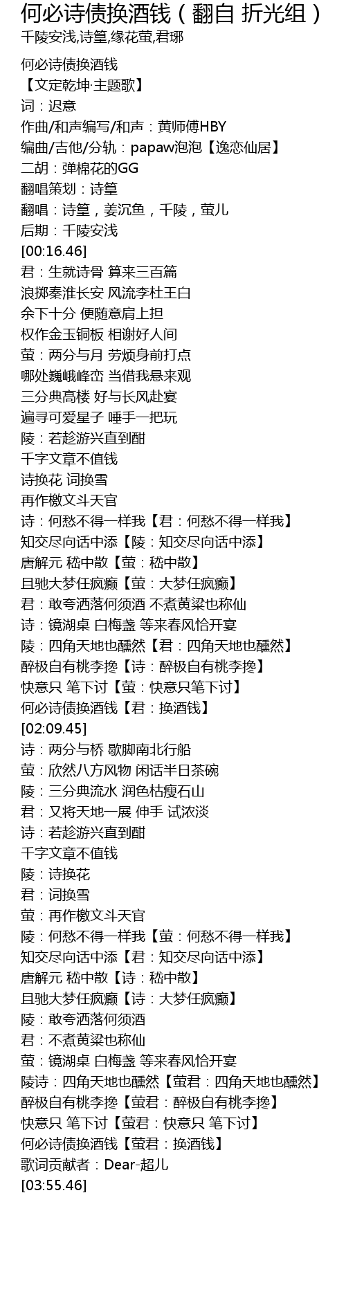 | [02:00.44] | 何必诗债换酒钱【君:换酒钱】 |