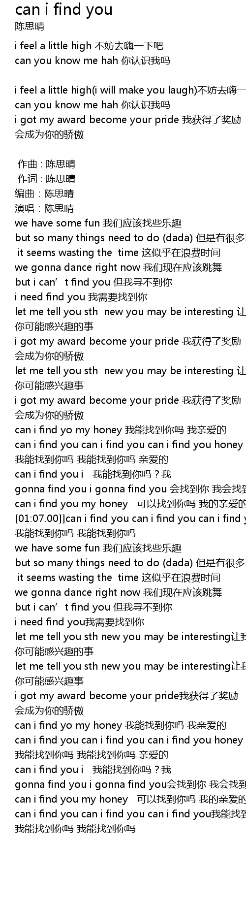 | [02:23.00] | can i find you can i find you can i find you wǒ néng zhǎo dào nǐ ma wǒ néng zhǎo dào nǐ ma wǒ néng zhǎo dào nǐ ma |
