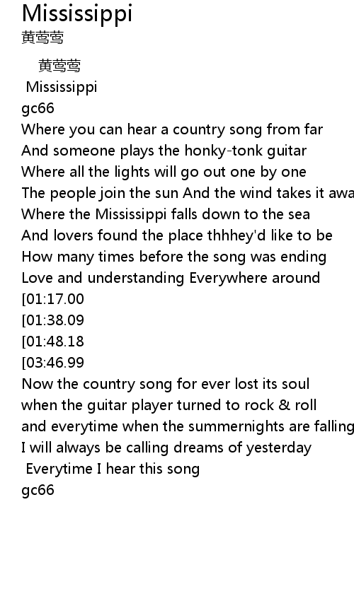 | [03:26.08][01:48.18] | Mississippi you' ll be on my mind Everytime I hear this song |