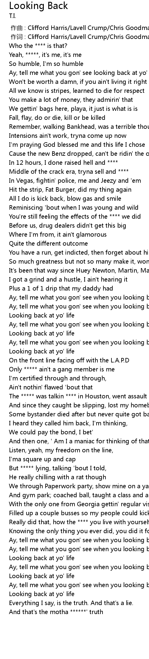 | [01:32.35] | Ay, tell me what you gon' see when you looking back at yo' life |