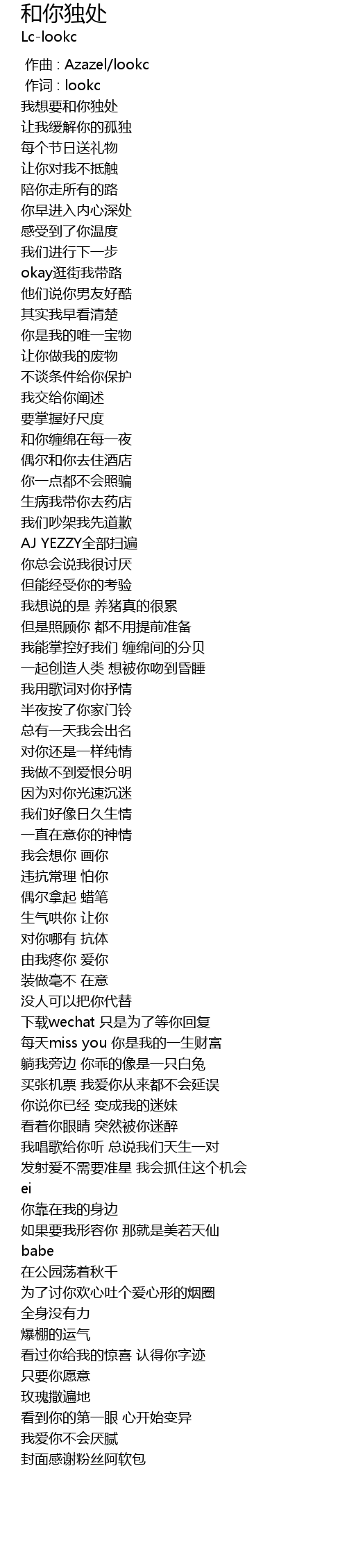 | [00:13.800] | wǒ xiǎng yào hé nǐ dú chǔ |