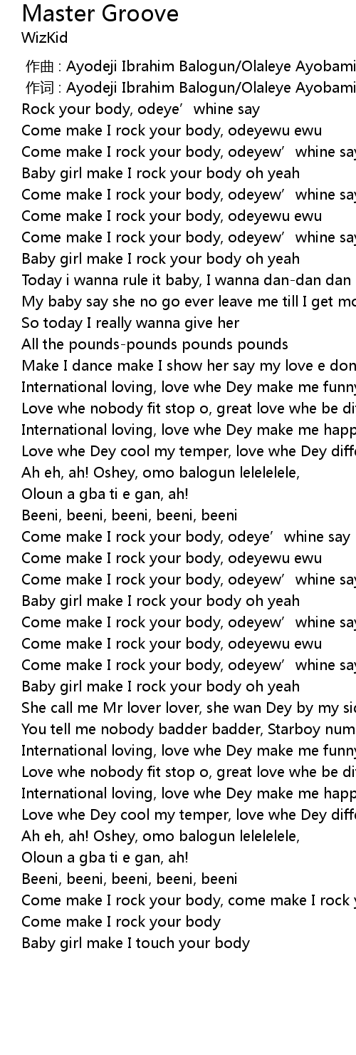 | [01:38.02] | Come make I rock your body, odeyew’whine say |