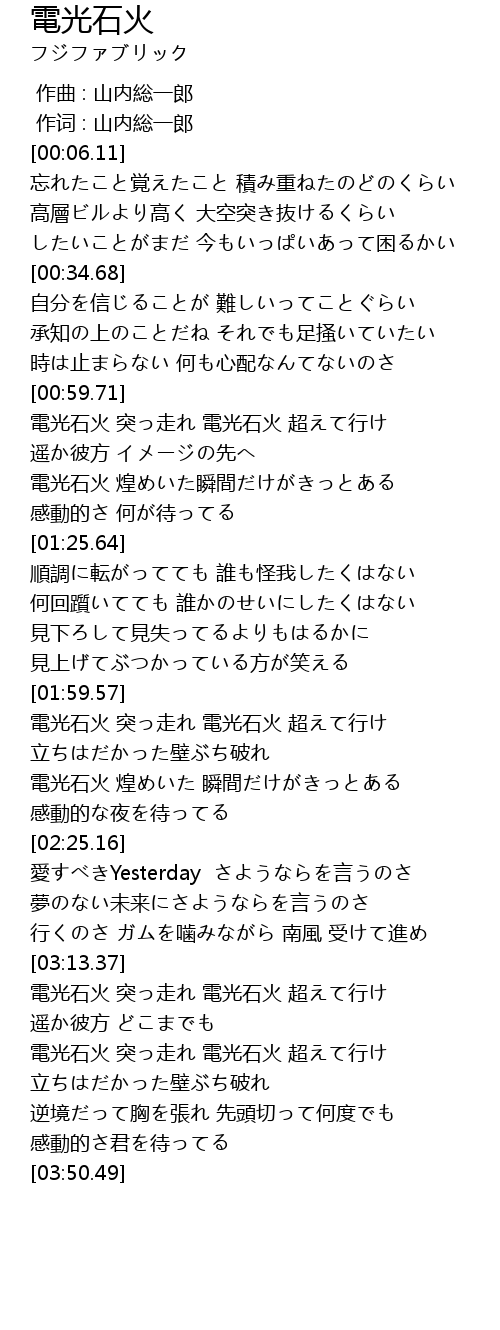 | [03:26.50] | 電光石火 突っ走れ 電光石火 超えて行け |