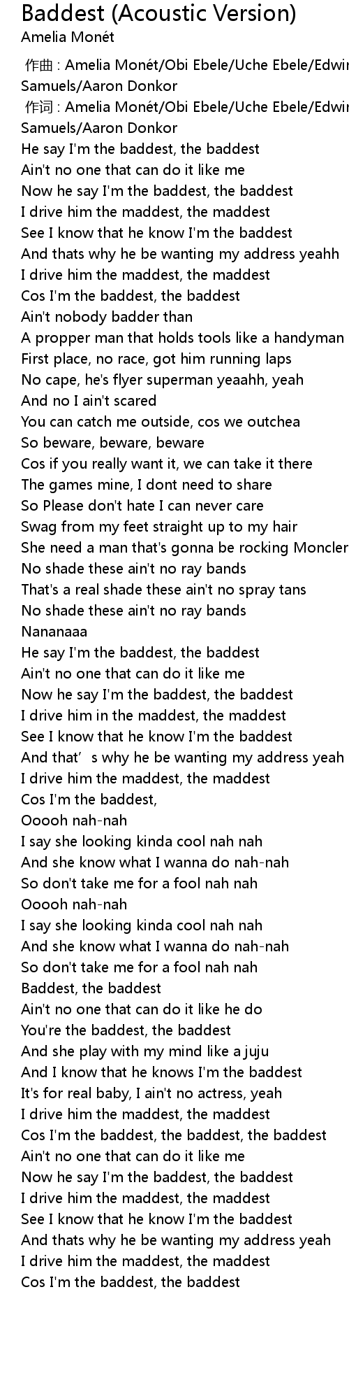 | [01:16.30] | Now he say I' m the baddest, the baddest |