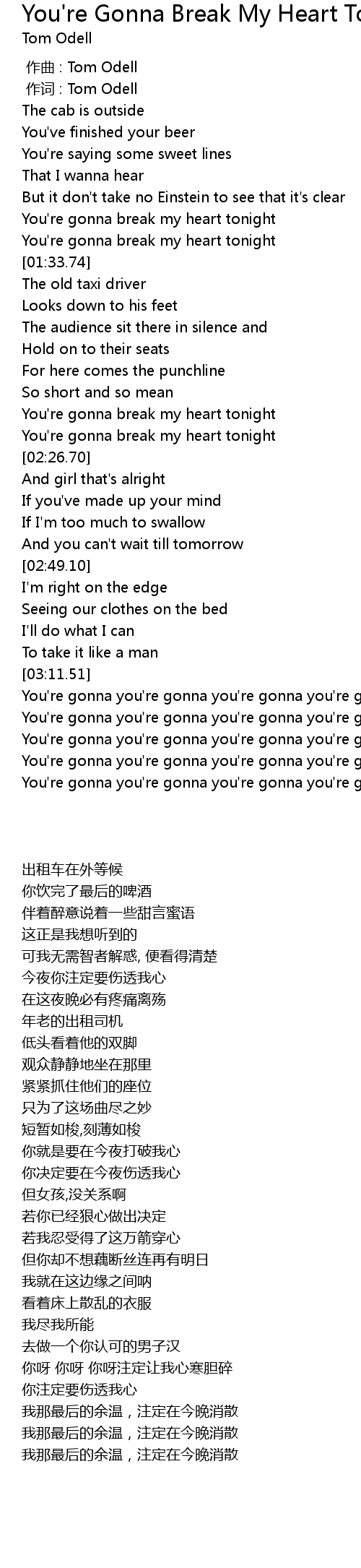 | [02:19.97] | You' re gonna break my heart tonight |