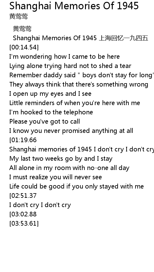 | [03:27.89][03:02.88][02:23.20] | Shanghai memories of 1945 I don' t cry I don' t cry |