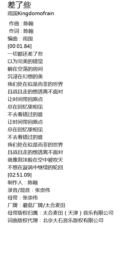 | [02:52.40] | 母带版权归属:太合麦田(天津)音乐有限公司 |