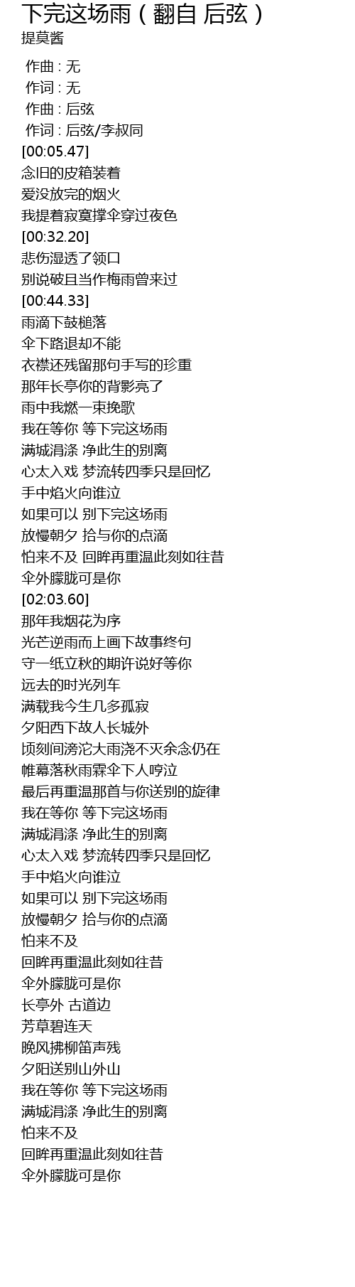 | [00:01.00] | 作词 : 后弦/李叔同 |