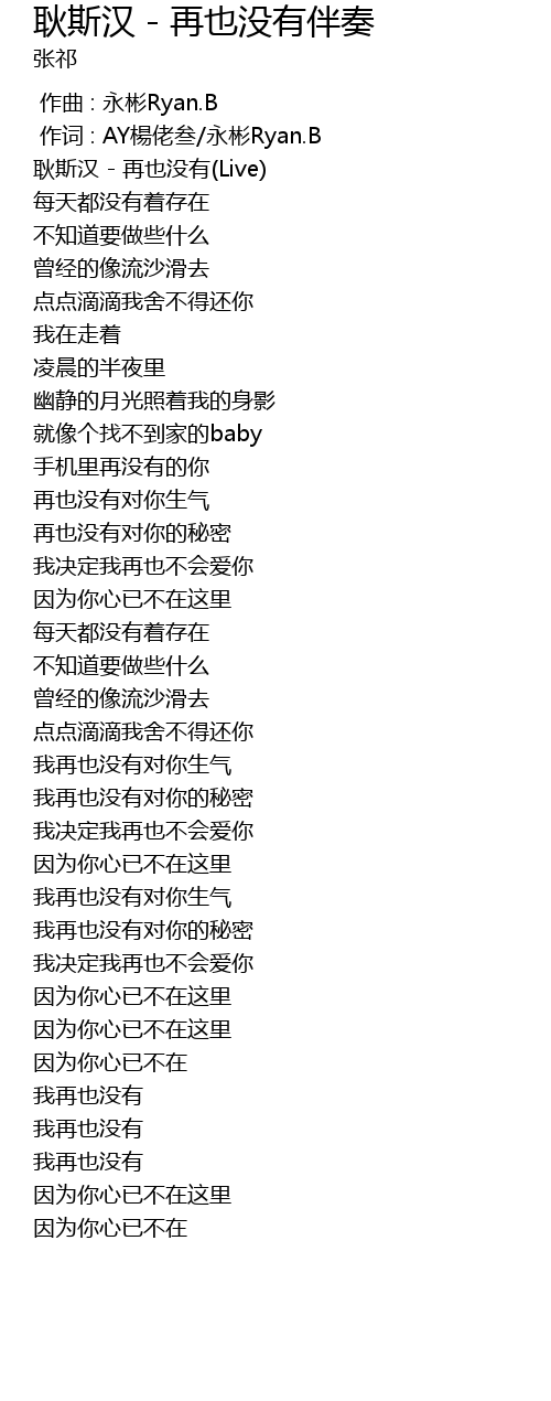 | [00:01.620] | 耿斯汉 - 再也没有(Live) |