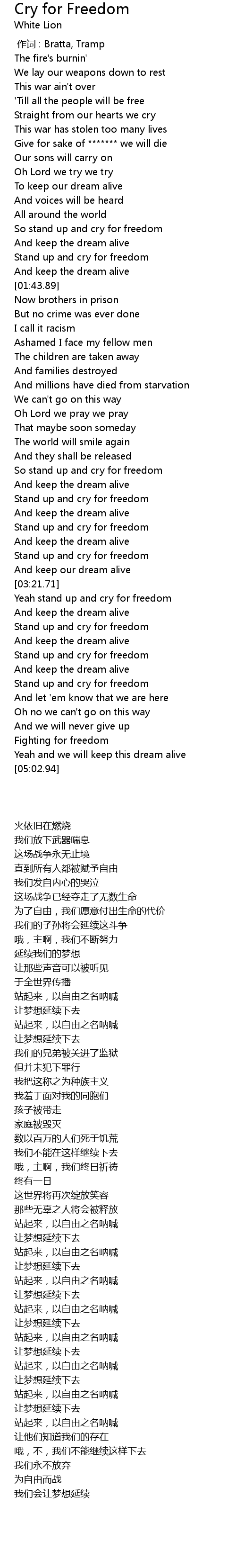 | [04:33.87] | Stand up and cry for freedom |