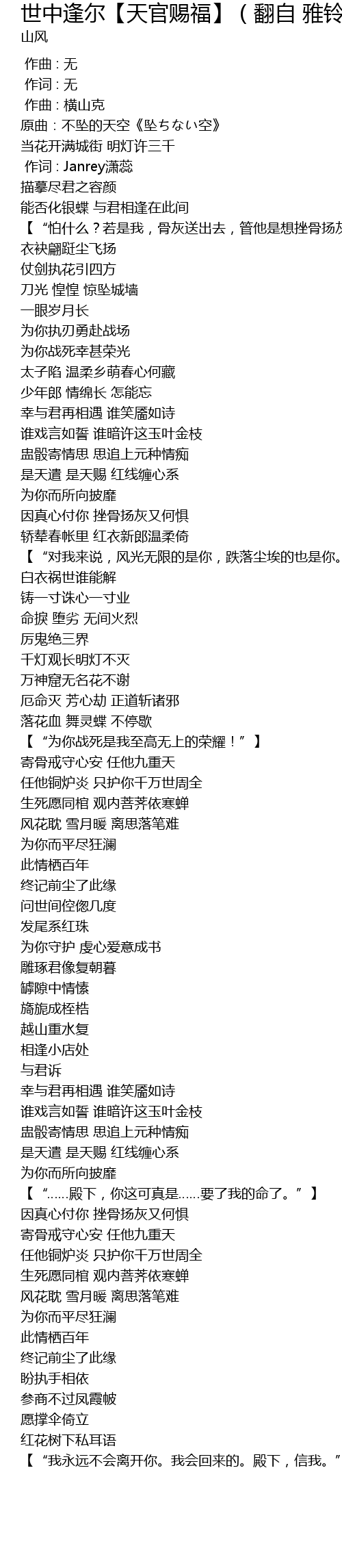| Song | 世中逢尔【天官赐福】(翻自 雅铃) |