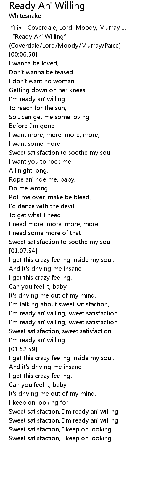 | [01:34.90] | I'm ready an' willing, sweet satisfaction. |