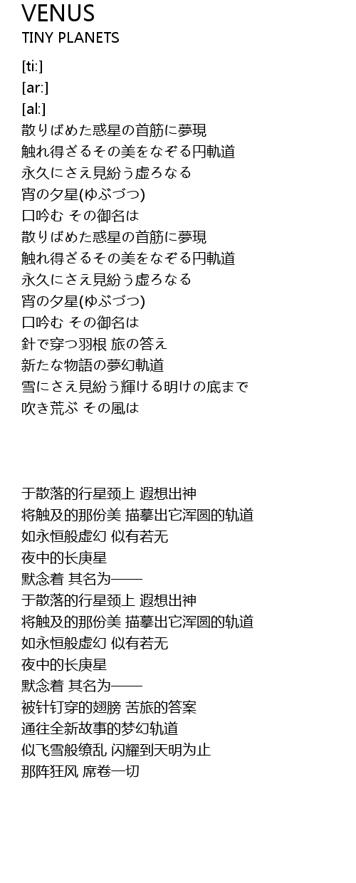 | [02:21.33] | 散りばめた惑星の首筋に夢現 |