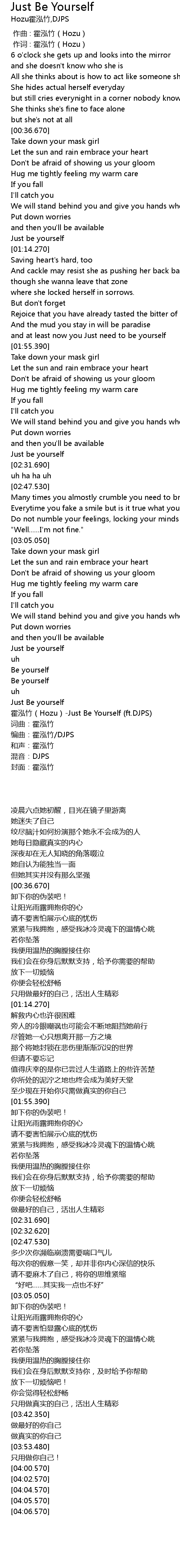 | [04:00.570] | 霍泓竹(Hozu)-Just Be Yourself (ft.DJPS) |