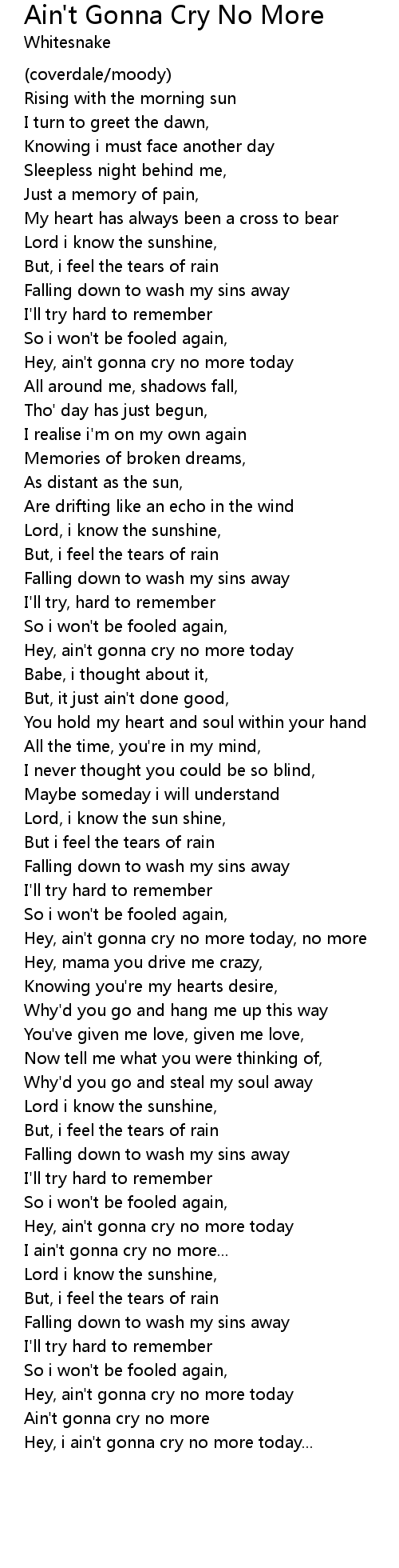 Ain't Gonna Cry No More Lyrics