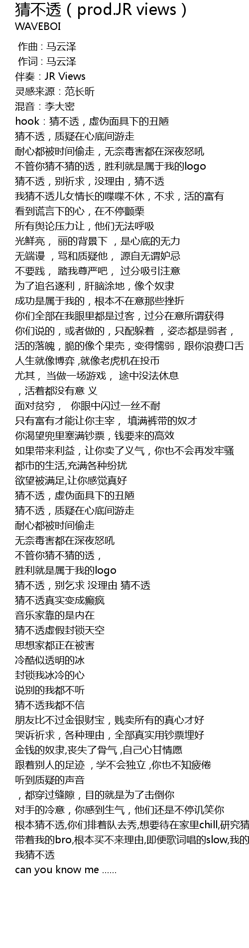 | [00:13.050] | hook: cāi bu tòu, xū wěi miàn jù xià de chǒu lòu |